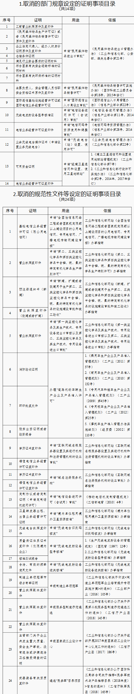 例如,取消的部门规章设定的证明事项目录中,取消了申请“组建卫星通信网和设置、使用卫星地球站”所需的可用资金证明和电信业务经营许可证复印件。取消的规范性文件等设定的证明事项目录中,取消了申请“无线电台识别码核发”所需的无线电台执照复印件。