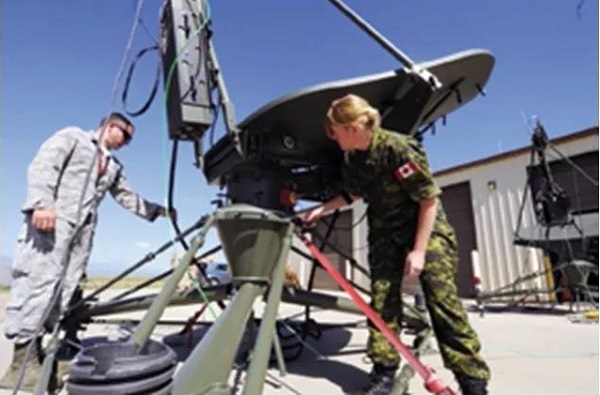 图2 美国空军上尉与加拿大联络官设置美国空军的地面多波段终端(GMT)天线