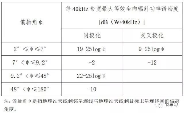 二、晴朗天气条件下,在指向对地静止卫星轨道目标卫星3度之内的任何方向偏轴角ψ上的最大等效全向辐射功率谱密度不得超出以下限值: