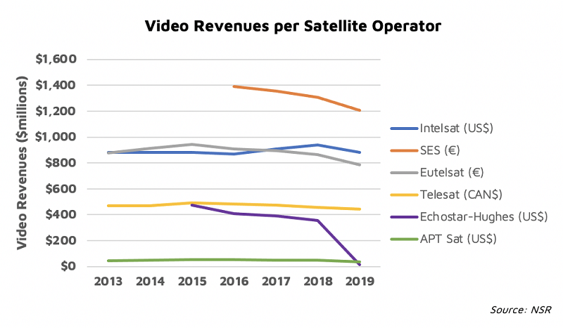 视频(包括DTH和视频分发)收入继续大幅放缓,所分析的前六大运营商2019年同比累计减少15.1%。SES和Eutelsat继续面临价格下降的挑战,欧洲热点地区仍然面临压力。2019年,随着美国付费电视的不利因素继续存在,休斯将其视频业务ESS部门出售给同一母公司旗下的DISH Network,累积视频收入进一步下降。